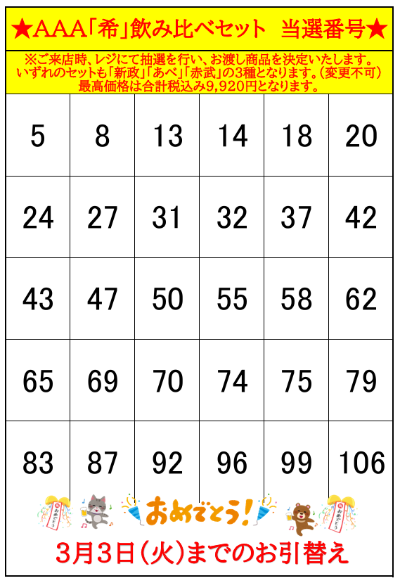 当選番号のお間違いがございませんよう、お気を付けくださいませ。