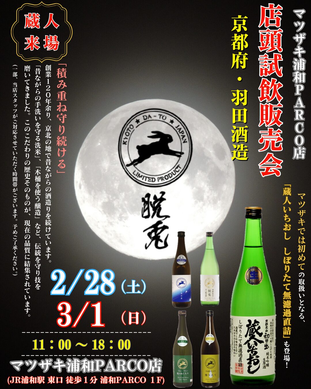 2月28日(土)・3月1日(日)にマツザキ浦和パルコ店にて「脱兎」を手掛ける羽田酒造の蔵人が来店し試飲販売会を行います!